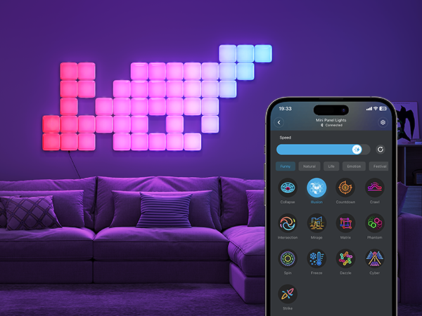 From “Cyber” to “Mirage,” Mini Panels offer curated lighting modes across categories like Emotion, Festival, and Life. Tap to transform your space.