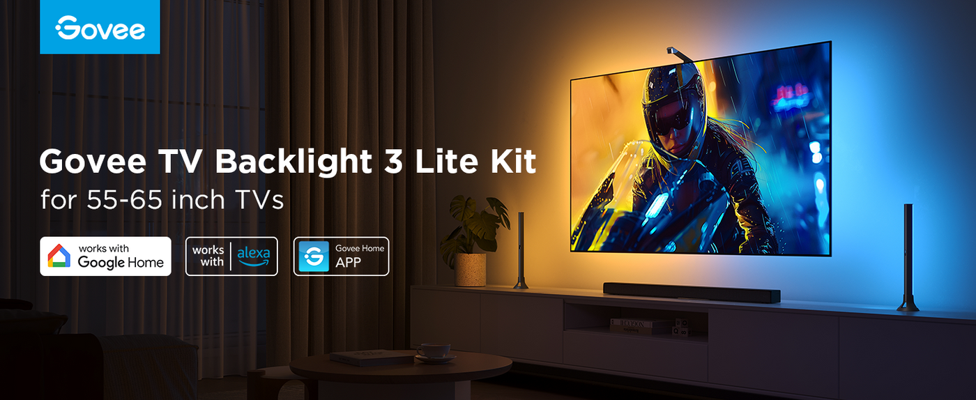 Govee TV Backlight 3 Lite Kit offers stunning lighting effects. It has 4-in-1 light beads for vivid visuals, video and audio syncing for an immersive atmosphere and smart voice and app control for convenient customization. The Fish-Eye Correction camera expands the effective range, ensuring accurate color-matching. With a gravitational hanging design and compatibility with Alexa and Google Assistant, this kit delivers the ultimate home theater experience.
