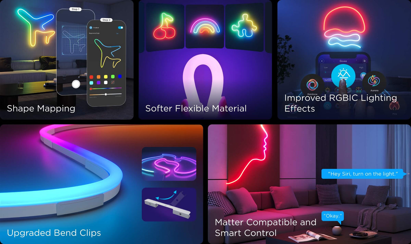 Add a vibrant touch to any room with the Govee Neon Rope Light 2. Shape recognition technology allows for easy customization, while upgraded clips make bending and creating your desired shape easy. Illuminate your space with this versatile and dynamic lighting option.